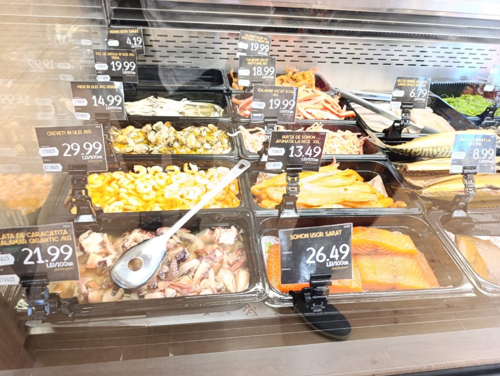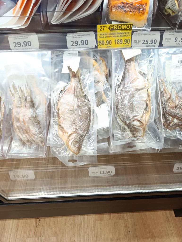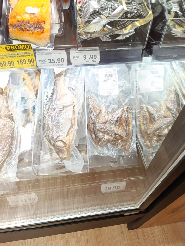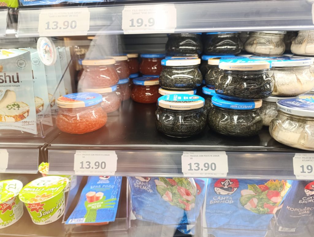În magazin era foarte mult pește, de toate felurile: uscat, marinat, afumat, în conserve – sardine, în ulei – absolut tot ce vrei.Nu găsești doar icre negre, ci și icre roșii sau de crap.