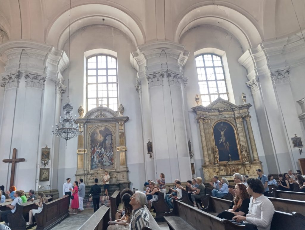 Acustica bisericii este fenomenală, astfel că aici se țin deseori concerte. La unul din ele ne-am nimerit și noi. Lume multă pe scări, muzică puternică din interior, ne-au făcut să grăbim pasul pentru a vedea ce se întâmplă. Am rămas surprinși să vedem ansamblu de percuție și tobe într-o biserică, multă lume adunată și emoție cât nu se poate tasta. Mi-am pornit imediat telefonul, pentru a păstra o bucățică de concert pentru blogul nostru, sacrificând calitatea, în timp ce Ștefan mă bombănea „că dau cu filmarea de toți pereții și mă uit după avioane”.