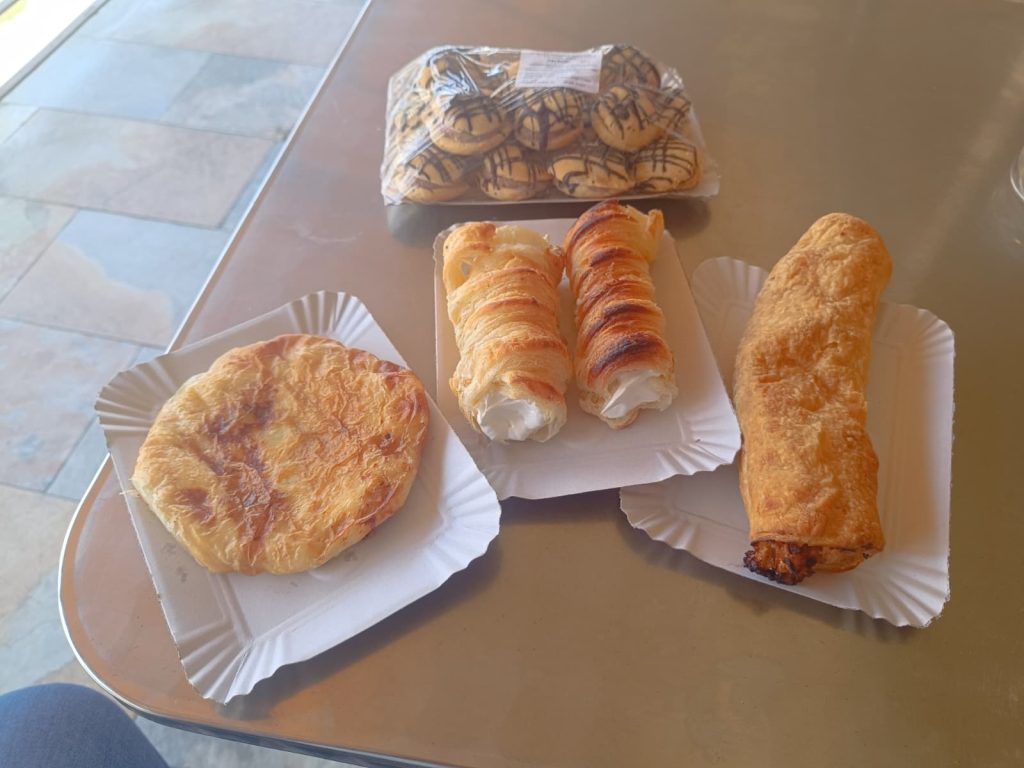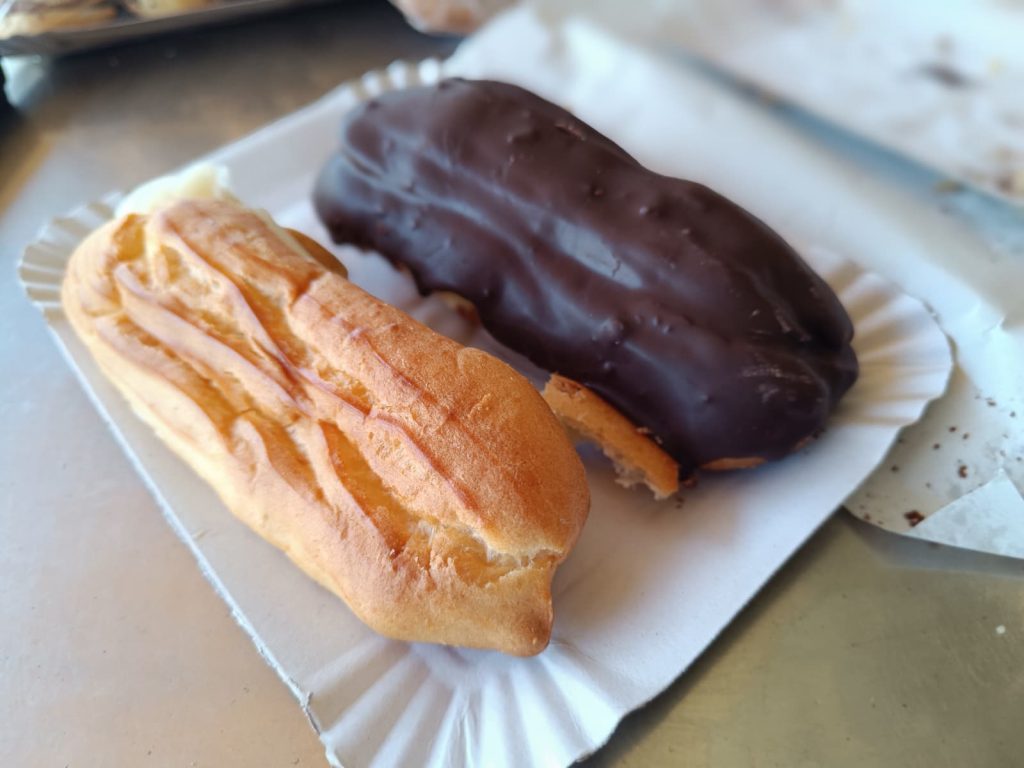 Așadar am plecat pentru rulouri și plăcintă cu brânză. În prima fază am adaugat și două eclere: unul cu ciocolată, altul simplu. Și când stam noi pe terasă, să le înghițim, lingându-ne degetele, de spumă cu lămâie, chiar îi spuneam lui Ștefan: