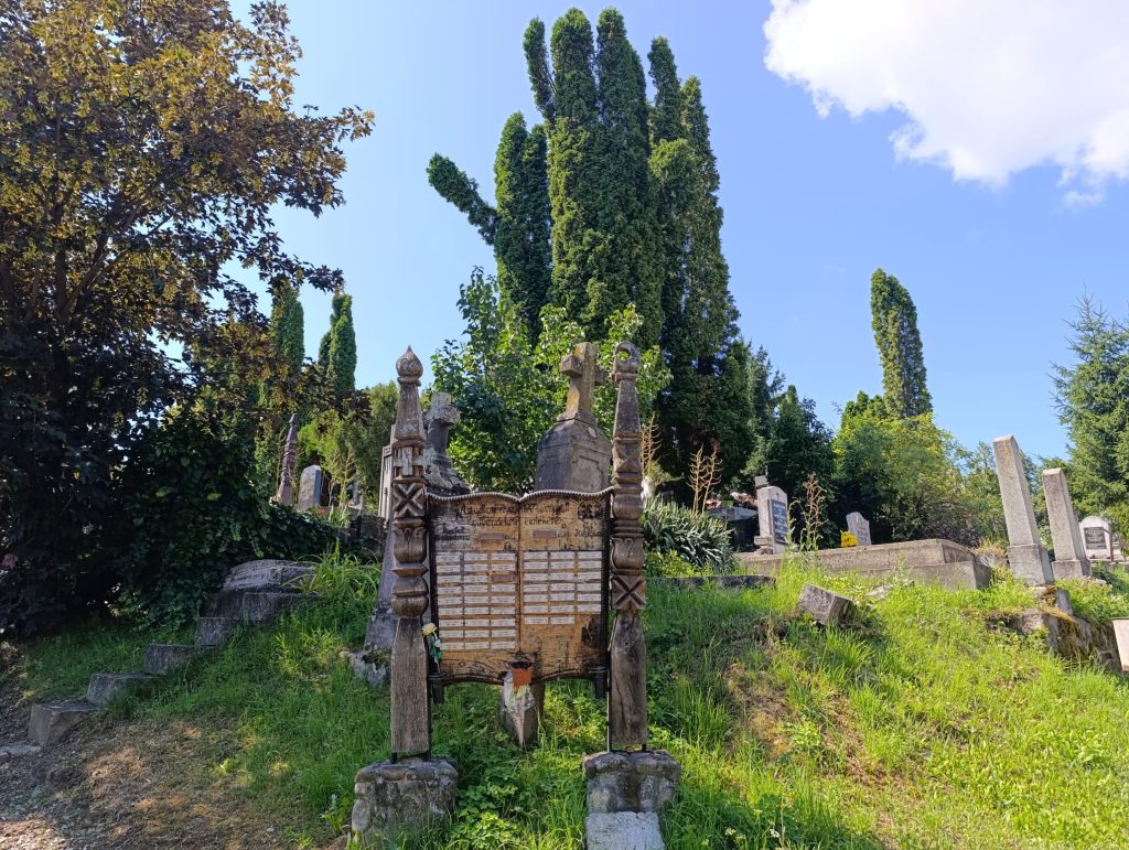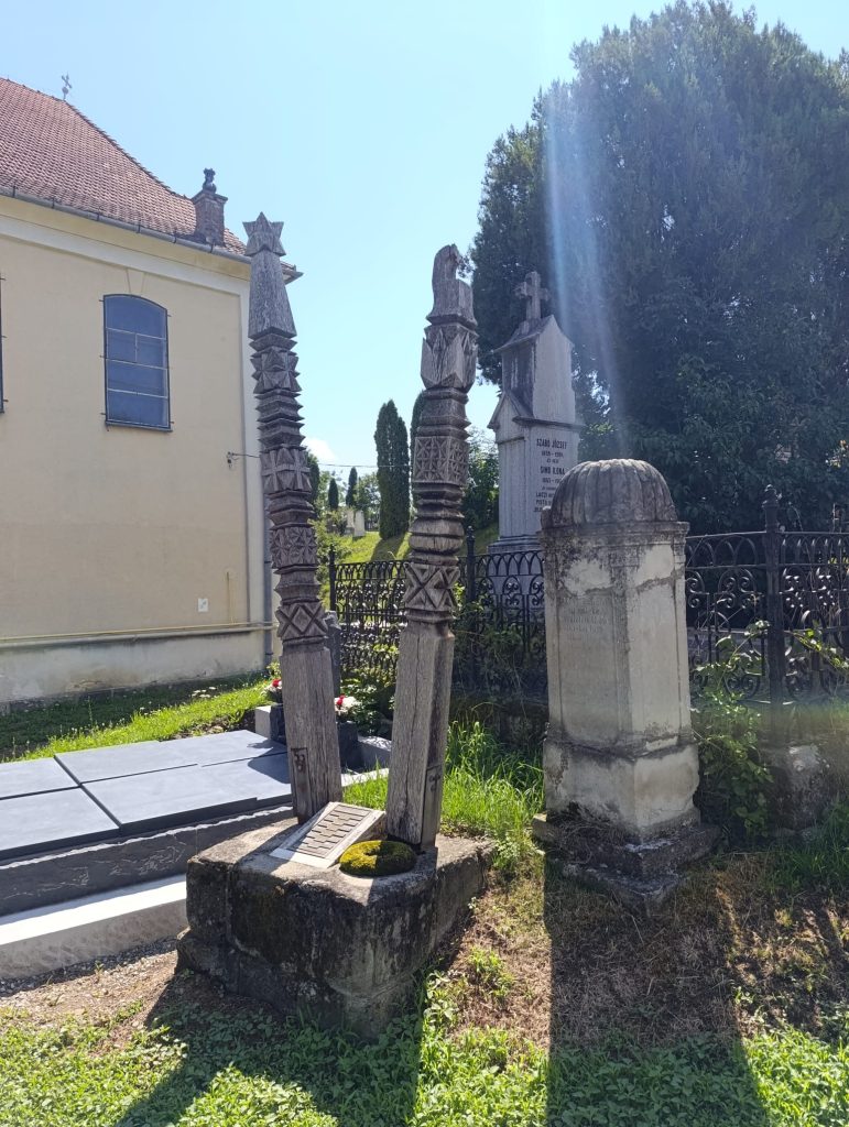 Mi-a atras atenţia un monument funerar din lemn sculptat. N-am ştiut la faţa locului ce poate reprezenta, ci ne-am documentat ulterior. Făcând o comparaţie am realizat că, aceste simboluri apar şi pe porţile tradiţionale secuieşti: crucea, rombul şi rozeta solară. M-am apropiat de acest monument funerar, cu mai multe nume pe el, unde era trecut anul naşterii şi anul morţii. Doar unul din aceştia scăpase. Mi-am pus întrebarea : Cine or fi?