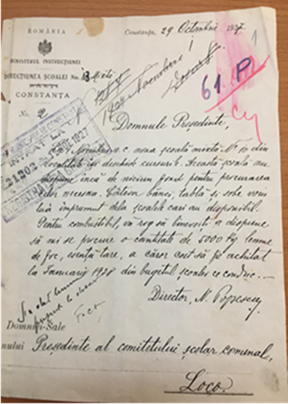 Se stipulează că la această școală mixtă va fi numit ,,însărcinat cu girarea afecerilor direcției” d-l N. Popescu, institutor la Școala de băieți nr 1 din localitate (Anexa 1.). Dintr-un document ulterior, în care directorul solicita ajutor pentru dotarea claselor și aprovizionarea cu lemne pentru iarnă, am aflat că școala primise numele de Școala mixtă nr 10 (Anexa 2).